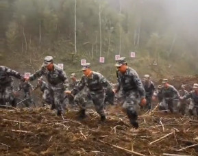 ▲解放軍牽手走過完成排雷的地區以示安全。(圖/翻攝自新浪新聞視頻)