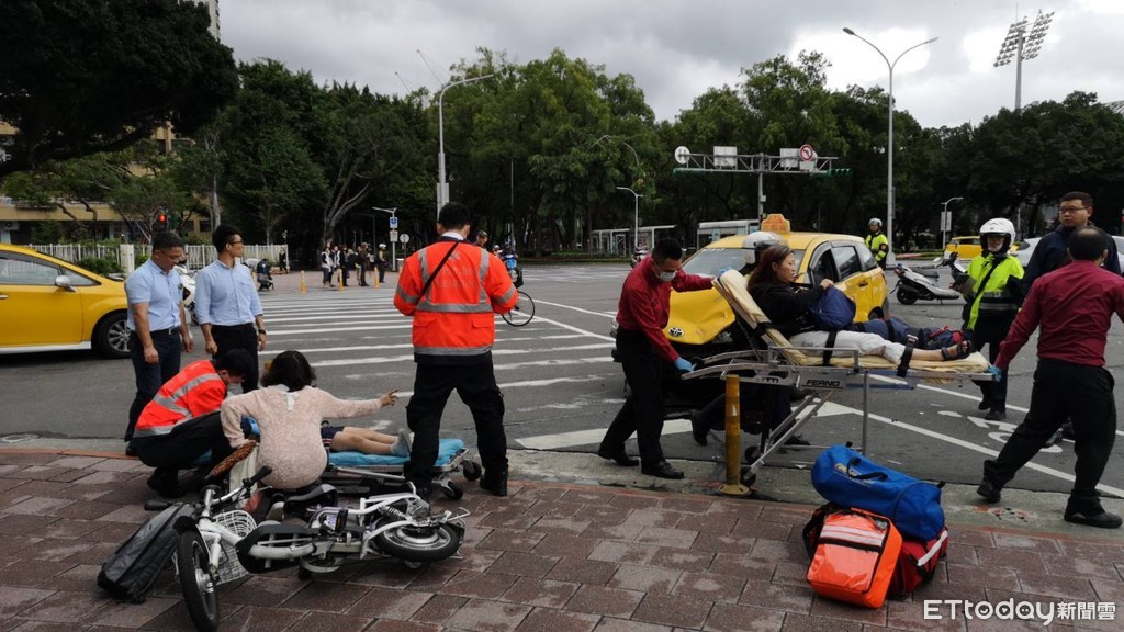 台北市敦化北路、八德路19日上午發生一起車禍意外,一輛計程車和一輛小客車碰撞,造成計程車失控撞到一旁騎車載著小孩的媽媽,導致母子兩人瞬間彈到一旁人行道上,一旁的民眾見狀趕緊報警。