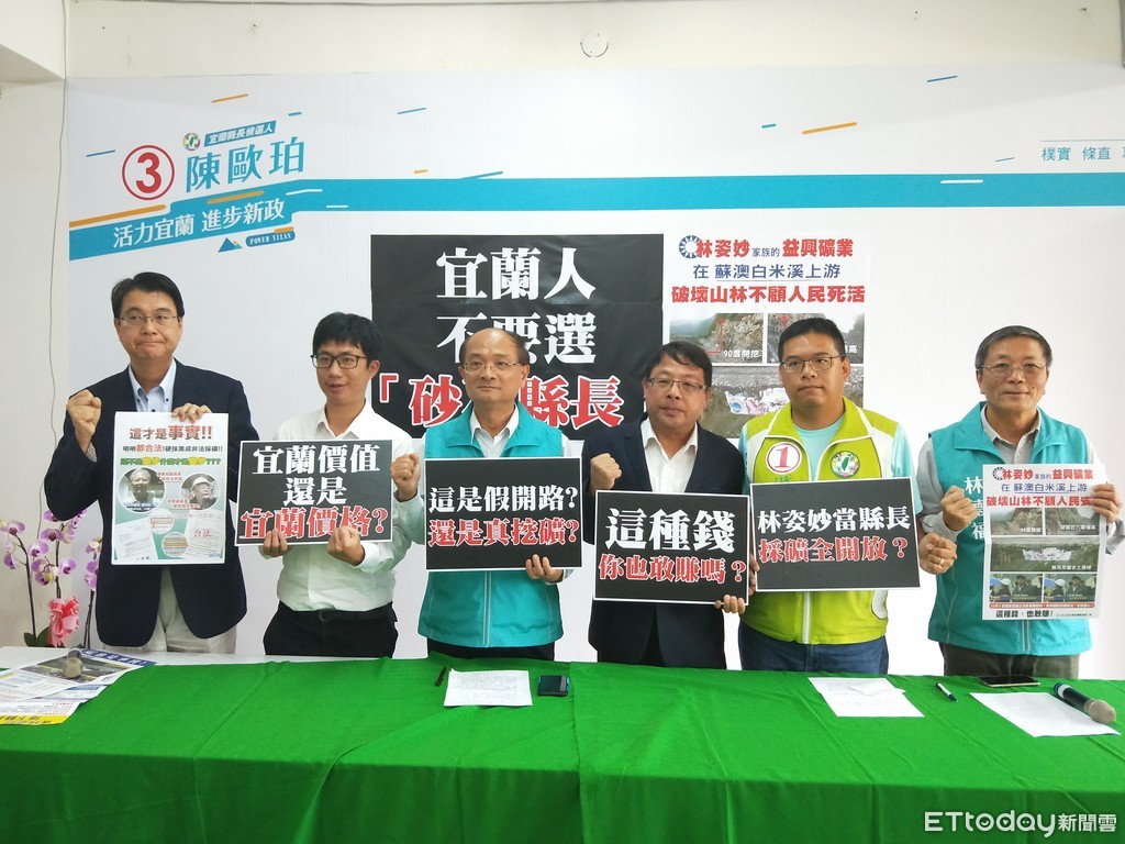 ▲民進黨宜蘭縣長候選人陳歐珀競總,18日開記者會,猛批林姿妙家族都在經營砂石採取、土地開發,當選後恐成「砂石縣長」,若指控不實願退選。(圖/記者游芳男攝,下同)