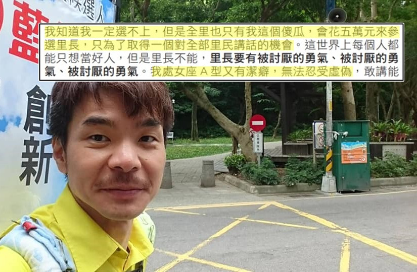 打開新北市中和區第3屆里長選舉的選舉公報,只見民國62年出生、無黨籍的藍維鼎政見欄寫著,「我知道我一定選不上,但是全里也只有我這個傻瓜,會花5萬元來參選里長,只為了取得一個對全部里民講話的機會。這世界上每個人都能只想當好人,但是里長不能,里長要有被討厭的勇氣、被討厭的勇氣、被討厭的勇氣。」