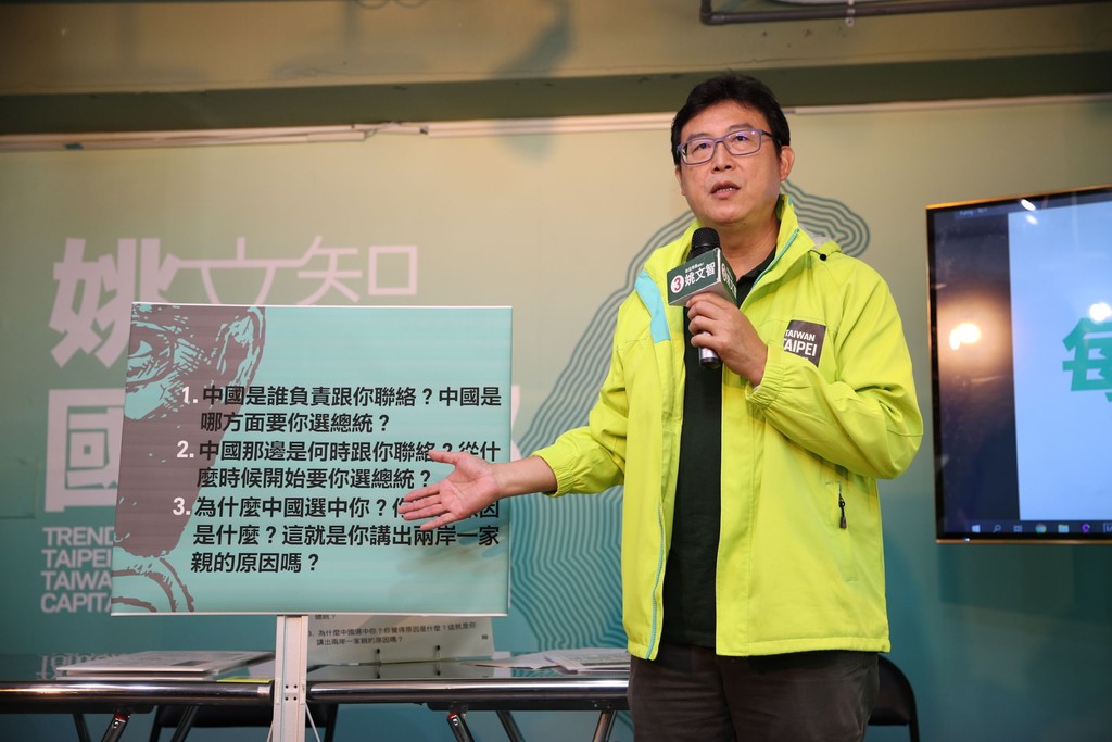 姚文智表示,以陳佩琪先前在臉書發文「沒有人要退出政壇」為例,「沒事,自己的太太會用那樣的方是喊話嗎?」他接著說,丁守中是國民黨候選人,「綠營跟中間選民都投不下去」;柯文哲則是「市政上乏善可陳、不斷說謊」,以及接受「兩岸一家親」的態度,也是選民投不下去的一個原因,「國民黨投不下去,柯文哲投不下去,大家只要堅定意志投給姚文智就可以了。」