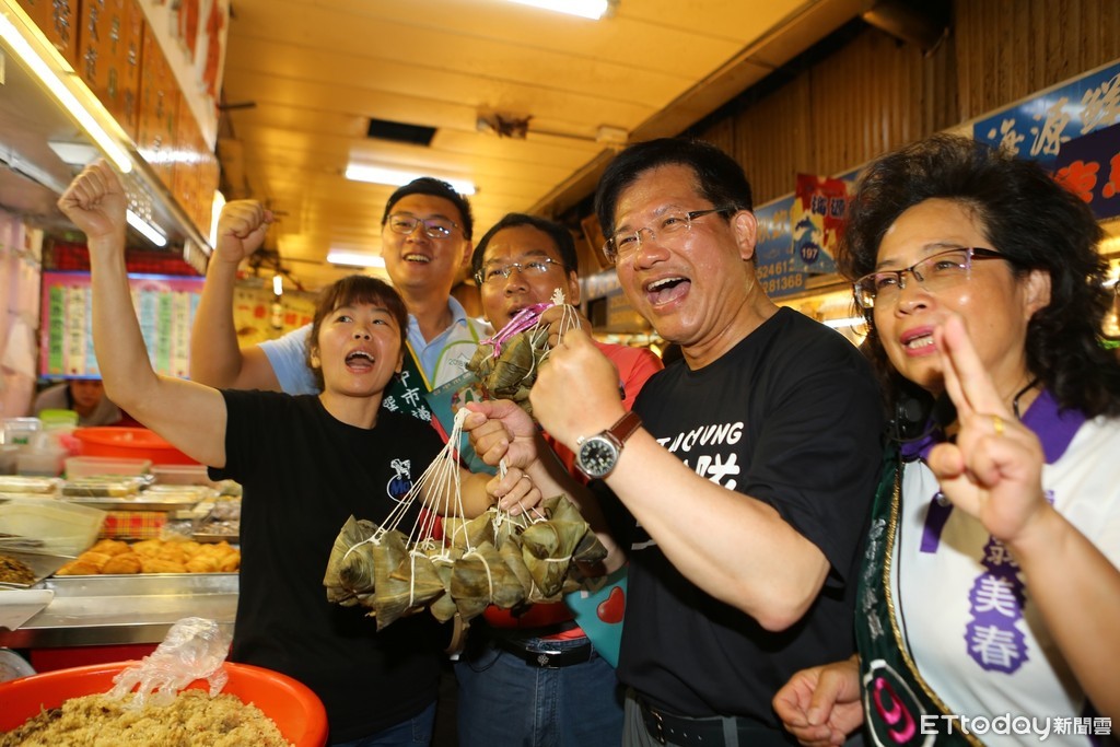 ▲林佳龍到豐原第一市場掃街拜票,民眾送上一串肉粽。(圖/林佳龍競總提供)