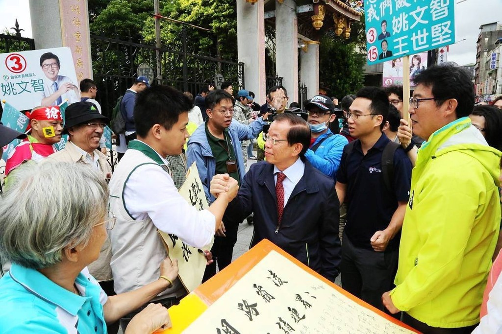 ▲駐日代表謝長廷陪同台北市長候選人姚文智前往大同區掃街拜票。(圖/記者李毓康攝)