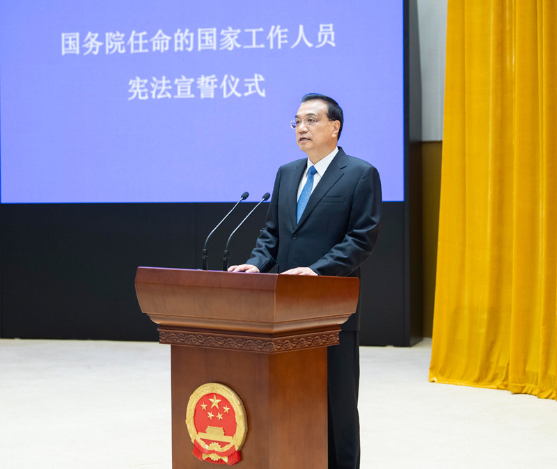 該儀式由國務委員兼國務院秘書長肖捷宣佈進行,唱完中華人民共和國國歌後,李克強要求大家忠於憲法,依法履職,實幹擔當,清廉自守,勤勉盡責做好本職工作,盡心竭力為群眾辦好事、解難事。