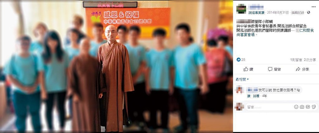 而淨耀所收的大徒弟,就是開泓法師,本刊調查,今年29歲的開泓,原本是佛教界的明日之星,甚至曾是中華佛教青年會第8屆祕書長、第9屆常務理事。知情人士表示,中華佛教青年會早年都是淨耀法師當理事長,到了目前第10屆的理事長開善法師,亦是淨耀的徒弟,可見青佛會與中國佛教會的關係淵源。