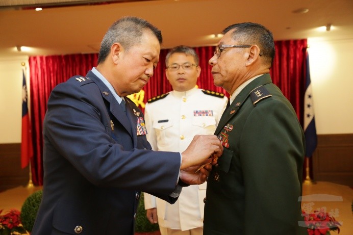 國防部副參謀總長胡開宏中將20日代表國防部長嚴德發,頒贈宏都拉斯駐華武官哥利亞上校「六等雲麾勳章」,象徵中華民國與宏都拉斯良好的交流互動,以及堅定永固的軍誼。