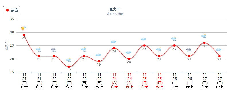 氣象局預報,周日(25日)至下周二(27日)東北風影響,北部及東半部地區仍有短暫雨;另外,有南方雲系接近,中南部山區亦有局部短暫雨的機率,其他地區為多雲的天氣。