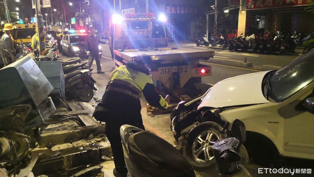 板橋區篤行路3段381巷21日凌晨發生一起自撞車禍,當時一名陳姓男子從五股剛參加完婚宴要返家,途中因為突然頭痛、身體不舒服,不慎失控撞上路邊的變電箱,造成附近住家大停電,還撞壞停放在路邊的7輛機車,副駕駛座朋友也掛彩送醫。