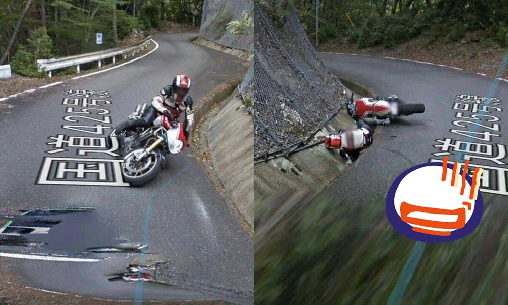 蠢事別亂做!因為不只「舉頭3尺有神明」,還可能有攝影機把你的一舉一動拍下來。一名網友貼出幾張照片,只見一名重機騎士騎在一條山路上,正準備過彎,Google Map不僅拍下他要壓車前的帥氣模樣,也把下一秒騎士摔車紀錄下來,而且他整個人還掉進一旁水溝裡,最糗時刻就這樣被全世界的網友看光光。