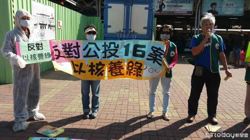 ▲台南環保團體在台南火車站,宣傳不同意公投案中的第16案「以核養綠」主張。(圖/台南環盟提供)