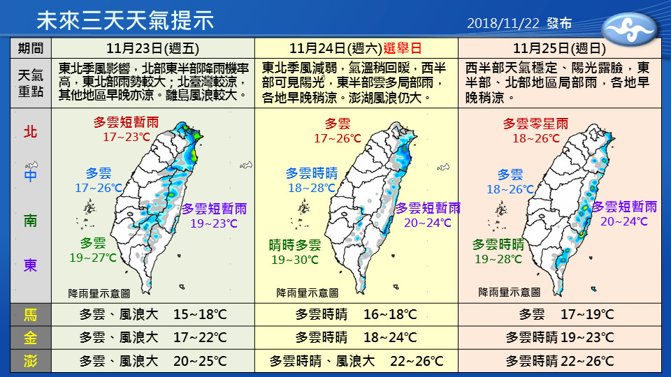 「未來3天天氣提示」圖顯示,23日(週五)受到東北季風影響,北部、東半部降雨機率高,東北部雨勢較大;北台灣較涼,其他地區早晚亦涼;另外,離島風量較大。24日(週六)選舉日,東北季風減弱,氣溫稍回暖,西半部可見陽光,東半部雲多局部雨,各地早晚稍涼;澎湖風浪仍大。25日(週日)西半部天氣穩定、陽光露臉,東半部、北部地區局部雨,各地早晚稍涼。