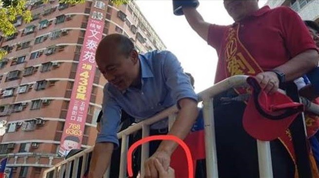 一名女網友在臉書《韓國瑜後援會》表示,「請老公幫我拍與韓總握手的畫面,結果真的只拍到(握手)」,仔細看看照片,韓國瑜上半身彎下,親切和支持者握手,但是女網友明明是要合照,畫面中卻只有韓國瑜,以及和鏡頭下的「一隻手」。