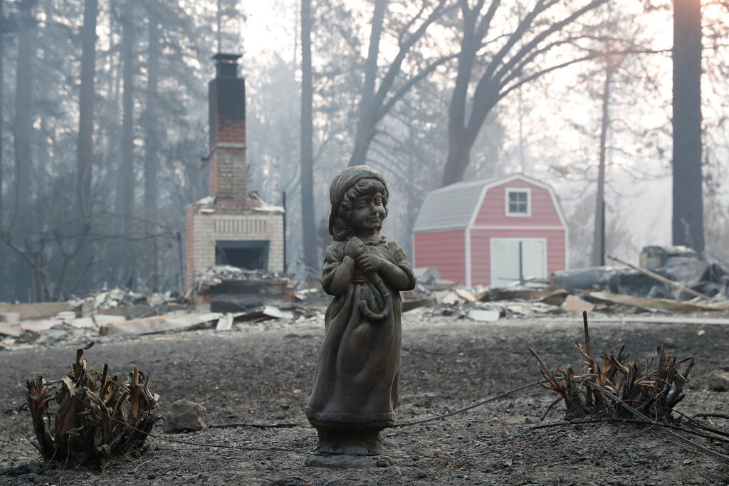 ▲加州天堂鎮災區,毀壞的房屋前僅剩一尊雕塑。(圖/路透)