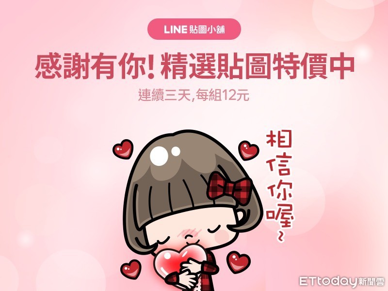 LINE貼圖活動頁面顯示,雖然感恩節過了,但感恩的心時時刻刻都要放在心中,對於粉絲朋友的支持與愛護,將連續三天推出精選貼圖特價12元,並從即日起的每天早上10:00時公布每日限時特惠的貼圖。