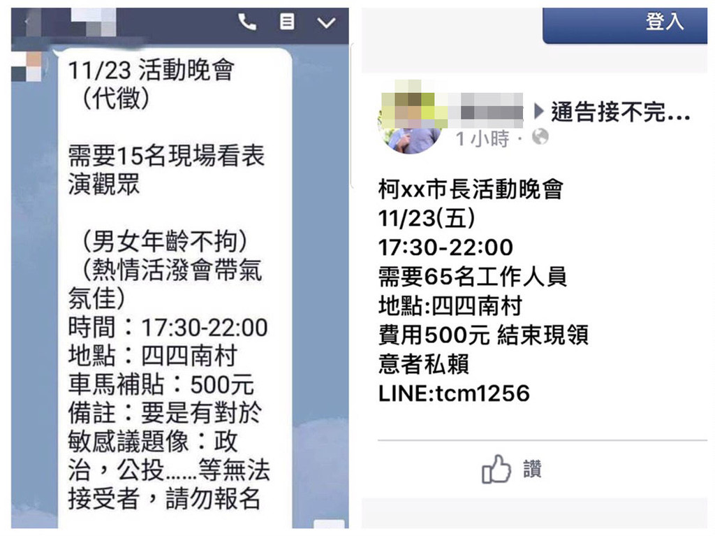 張姓、曹姓2名男子透過臉書社團和Line,張貼「柯**市長活動晚會,11/23(五) 17:30~2200 需要65名工作人員 地點:四四南村 費用500元 結束現領 意者私賴LINE」等文字。