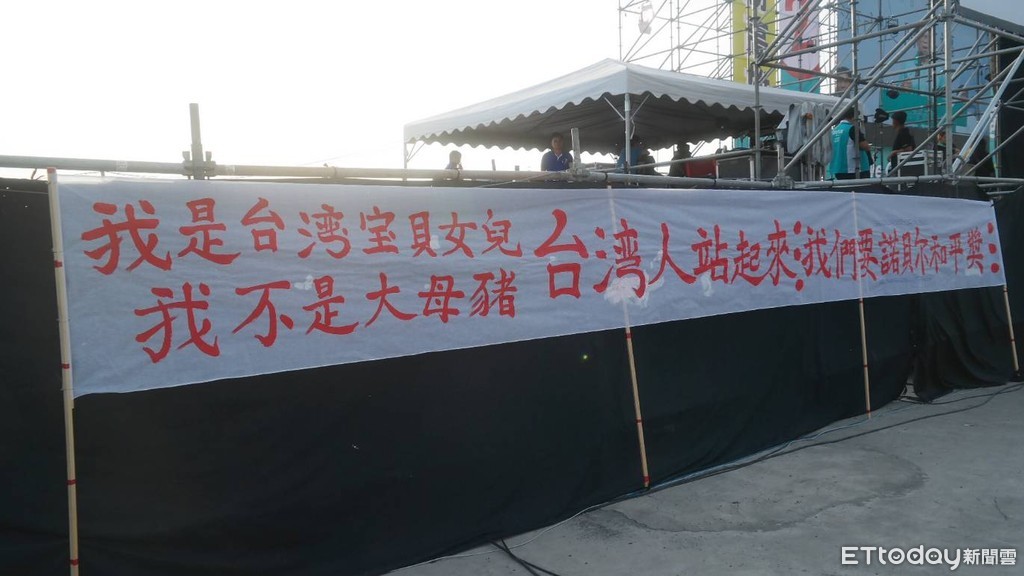 ▲活動掛「我不是大母豬」布條,替台灣女兒陳菊抱屈 。(圖/記者呂佳賢攝)