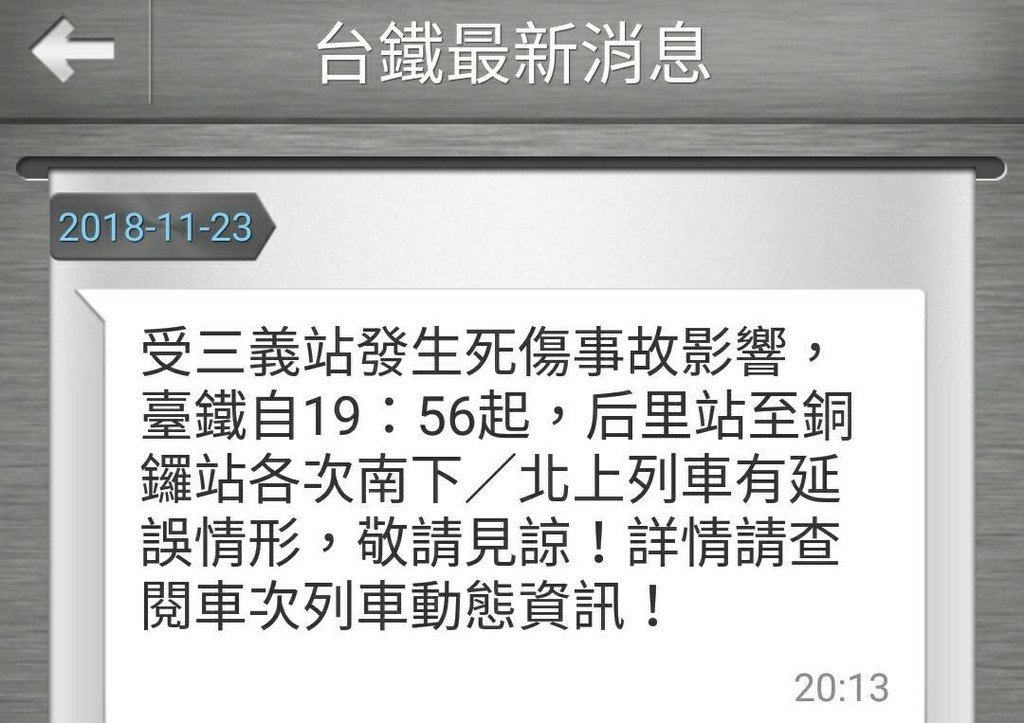 台鐵通報,晚間2次觀光列車,從台北一花蓮一台東一台中一台北的順行列車,19:56三義站開車後於西正線(第二股道),疑似有民眾落軌,發生死傷事故。台鐵表示,列車最後車廂離月台距離約10公尺,趕時間的旅客車站已派員嚮導換乘144次。受事故影響,山線上下行列車皆有延誤。