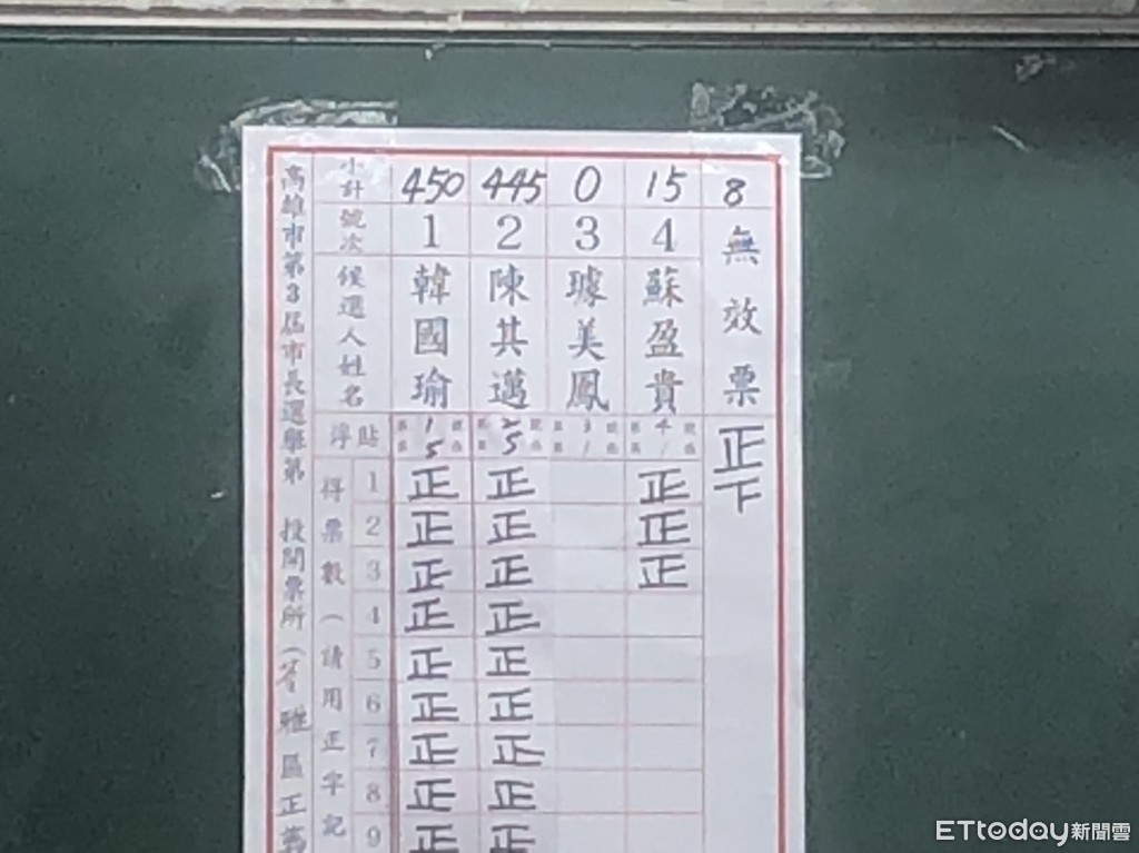 高雄市「章魚哥」指標里苓雅區正義里,歷屆選情比例誤差值落在2%以內,九合一大選持續開票,史上打得最激烈的高雄選戰,票數已經開出,第一票匭國民黨候選人韓國瑜以420票贏陳其邁401票,第二票匭韓450贏陳445、最終韓國瑜以870 票勝出24票。