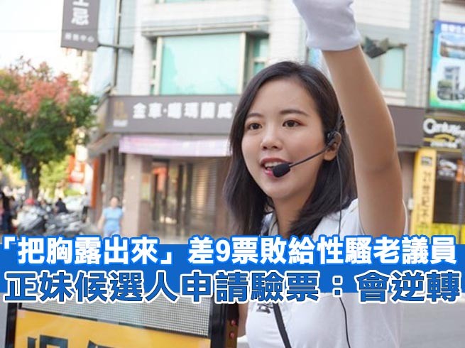 時代力量台中南屯區正妹候選人吳佩芸,選前將泳裝照放上競選看板上,遭民進黨議員何文海當眾一席狂語嘲諷:「既然都拍泳裝照了,身材很好,就把胸部露出來。」事後發文道歉,沒想到選舉結果吳佩芸以9票之差,敗給何文海,高票落選。她決定和律師討論,提出當選無效之訴,申請驗票。