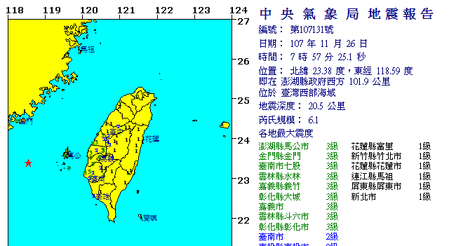 中央氣象局指出,台灣海峽07時57分發生規模6.1地震,震源深度20.5公里;08時15分又發生第二起地震,規模為4.7,震源深度18公里。震央位置在歐亞板塊內,較少發生地震,此次情況相當特別,所幸地震深度較淺,且與澎湖有一定距離,不至於有太大影響;震央周遭距離上次大規模地震記錄,已是24年前,1994年9月16日曾發生規模6.4地震。