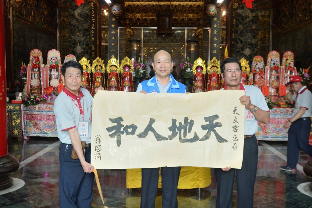 永安天文宮在今年3、4月時邀請韓國瑜到廟裡參拜。韓國瑜3月4日留下墨寶「天地人和」,還寫下名字;4月18日廟方則送他墨寶「運籌帷幄」,如今順利當選,廟方也公開祝賀。