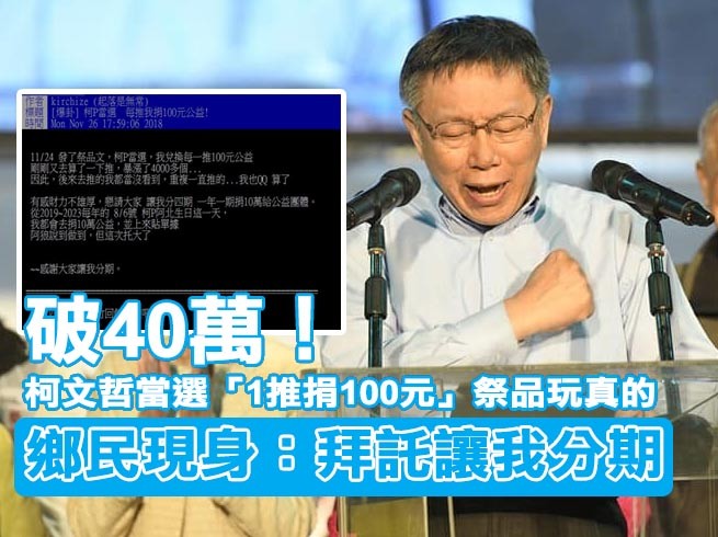 今年大選最激戰的區域莫過於台北市,尋求連任的台北市長柯文哲與國民黨候選人丁守中票數拉鋸,多數時間僅差1千票,當晚有資深鄉民發下宏願,承諾只要柯P當選,每一則推文就捐100元做公益,最後累積超過4000推,換算得捐40萬元。他今(26)日現身,保證會兌現承諾,「懇請大家讓我分4期」!