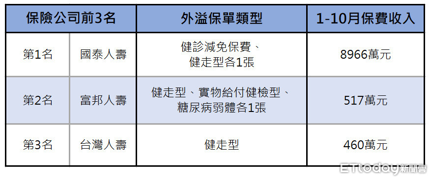 若以今年前10月保費收入前3大保險公司,第一名是國泰人壽8966萬元,國壽目前有1張健診減免保費與1張健走型;第二名是富邦人壽517萬元,富邦人壽目前有3張外溢保單,分別是健走型跟實物給付健檢型,還有糖尿病外溢保單各1張;第3名則是台灣人壽460萬元,台壽目前有1張健走型。
