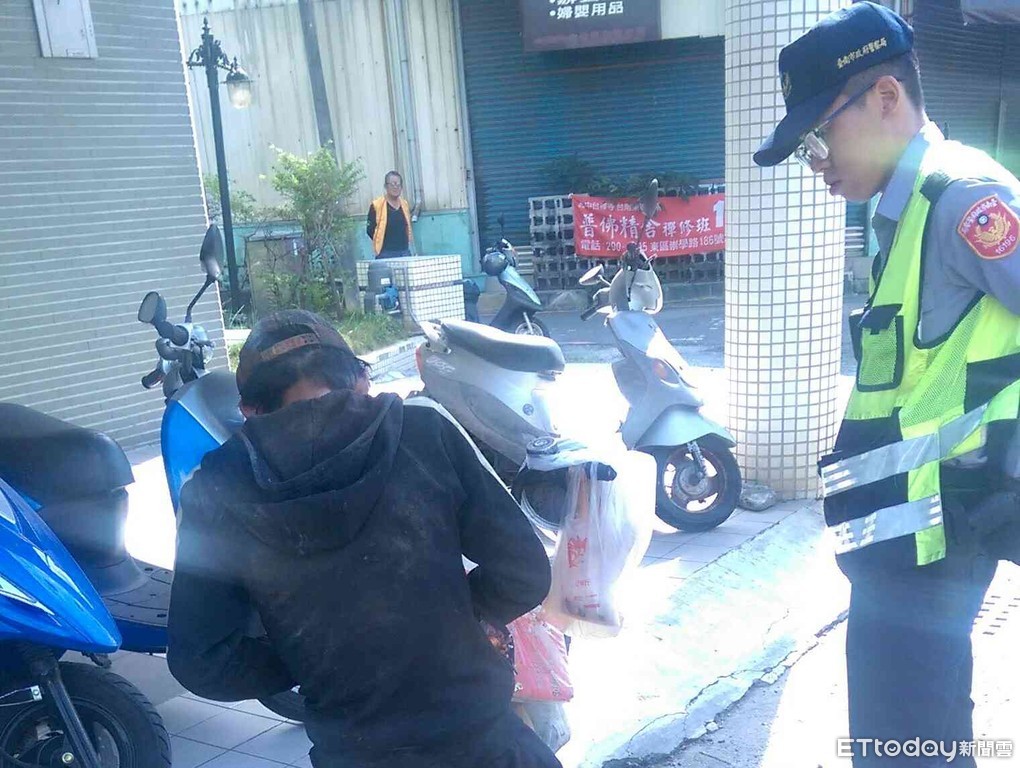 ▲盧姓街友丟亂酒瓶,被市警六分局鹽埕所警員王福祥、顏呈叡盤查,發現竟是名竊通緝犯。(圖/記者林悅翻攝)