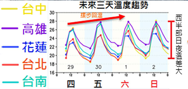 氣象局表示,未來五六日3天,冷高壓東移、東北季風減弱,台灣附近轉為偏東風為主,西部晴到多雲,僅東半部迎風面偶有短暫雨。各地白天高溫緩步回升,一天比一天回升約1度,北部高溫可回升到27度、中部29度、南部甚至可達30、31度,但早晚偏涼,中部以北低溫約19-20度,日夜溫差有將近10度。