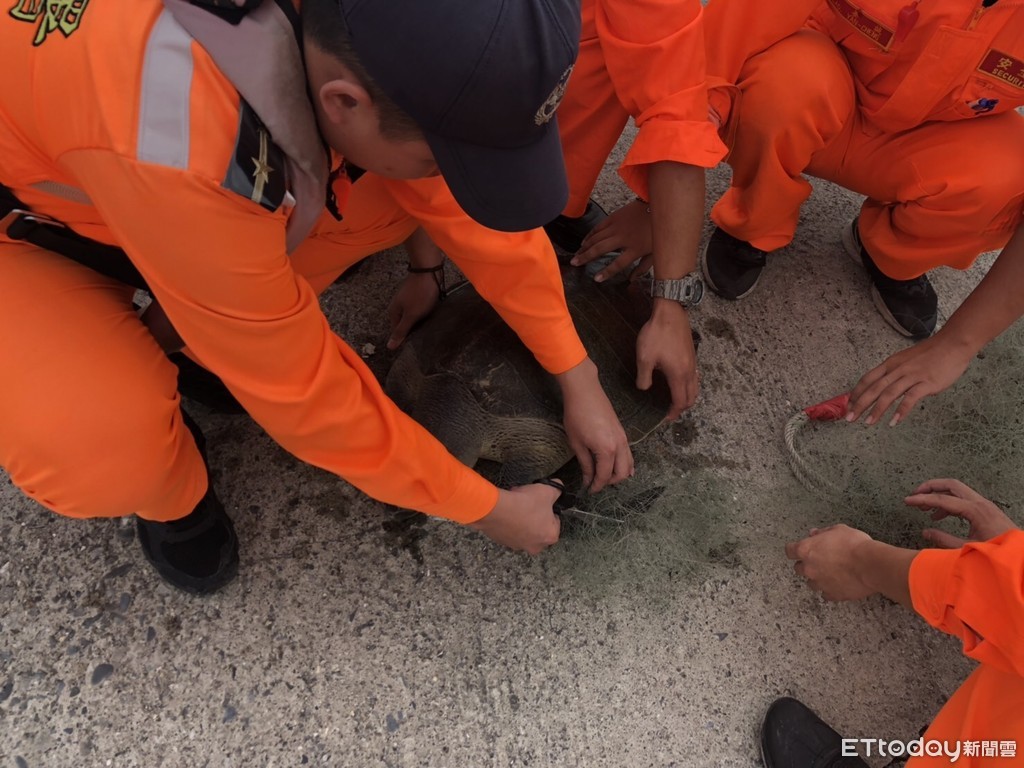 海巡署南部分署第11岸巡隊曾文溪安檢所安檢人員巡查港區時,於曾文溪第一停泊區發現1隻海龜遭廢棄漁網纏繞,即通知備勤人員實施救援工作,海巡人員搶救脫困,成大王建平教授研判品種為保育類欖蠵龜,將觀察後交屏東海生館帶回評估。