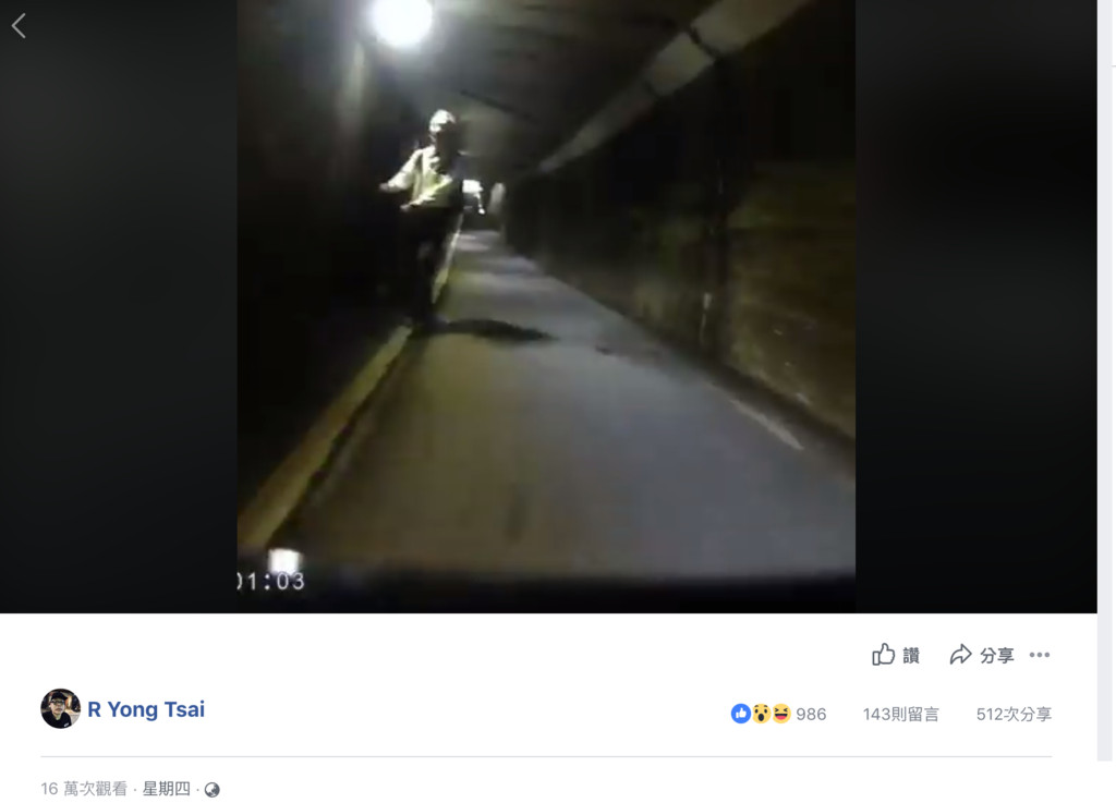 騎車真的要很小心,隨時要慎防有突發情況!民眾R Yong Tsai昨在個人臉書po行車紀錄器影片,當時他騎車要往淡水方向要進入地下道時,在轉彎的過程中突然發現一位老人逆向走在地下道內,當時雙方感覺都彼此都受到驚嚇,老翁瞬間靠牆閃壁,他也立即將車往右閃了一下才沒造成傷害,短短18秒的過程影片驚險萬分,引發討論。