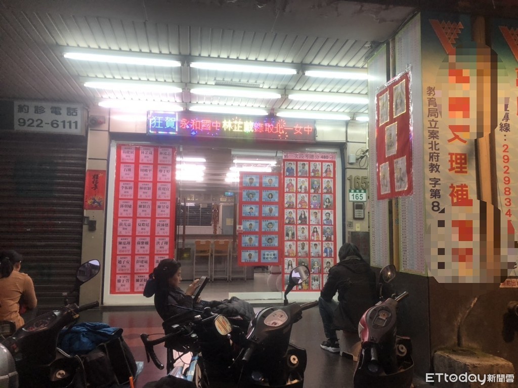 新北市永和區永福路上一處補習班門口前,30日晚間10時許,突然出現排隊人潮,有的人拿著椅子,直接坐在騎樓,有的人則是席地而坐。