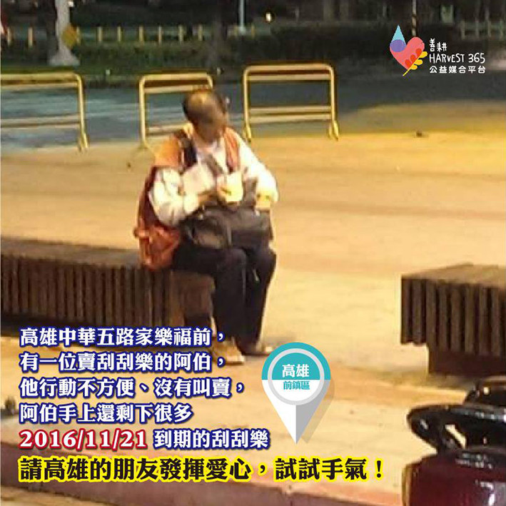 經過家樂福時,幾乎沒有看到幾個人跟他買,看到阿伯瘦小歪斜的身影,一個人默默坐在那邊,真的令人覺得很不忍心,希望在高雄或附近的朋友們,可以多多幫忙,發揮自己小小的力量來跟阿伯買刮刮樂,儘快讓阿伯手上快過期的刮刮樂賣掉!還可以試試自己的手氣!謝謝大家的愛心。