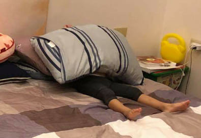 ▲小兒子把頭用枕頭蓋住,就以為媽媽找不到他。(圖/翻攝自爆廢公社)