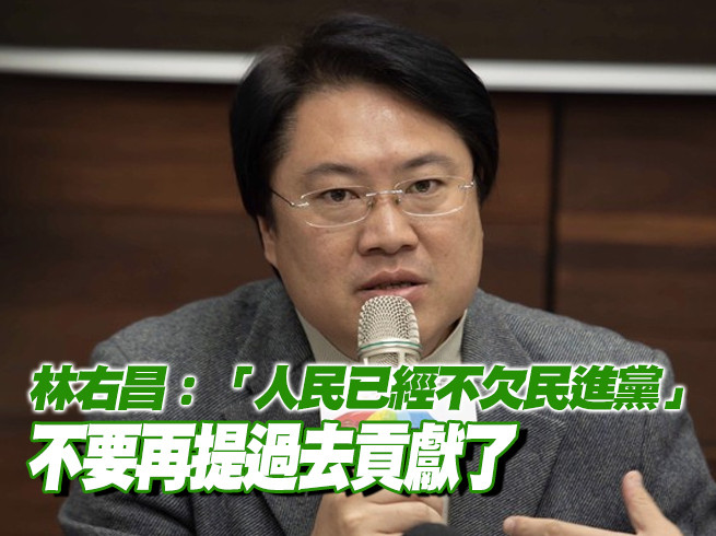根據《自由時報》報導,林右昌認為,台灣已經歷三次政黨輪替,民進黨也兩度成為執政黨,「台灣人民已經不欠民進黨」,不是過去民進黨沒有貢獻,而是隨著時代推進到現在,已經不需要再去講了。