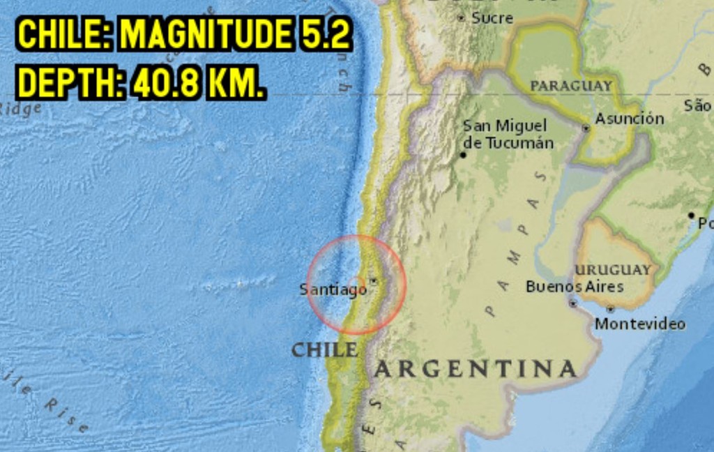 根據美國地質調查所(USGS)資料,南美洲國家智利當地時間5日下午2時12分發生規模5.2淺層地震,震央位於中部城鎮聖安東尼奧(San Antonio)南南西方約9公里處,震源深度40.8公里,首都聖地亞哥(Santiago)可感受明顯搖晃。目前未傳出有人員傷亡。