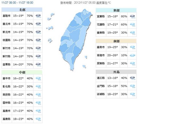 另外,中央氣象局也提醒,27日東北季風影響,北部、東北部氣溫仍低;台灣中部以北及東北部地區有雨,其他地區及澎湖、金門、馬祖也有短暫雨。28日鋒面影響,台灣中部以北、東半部地區、南部山區及澎湖、金門、馬祖有短暫雨,其他地區為多雲的天氣。