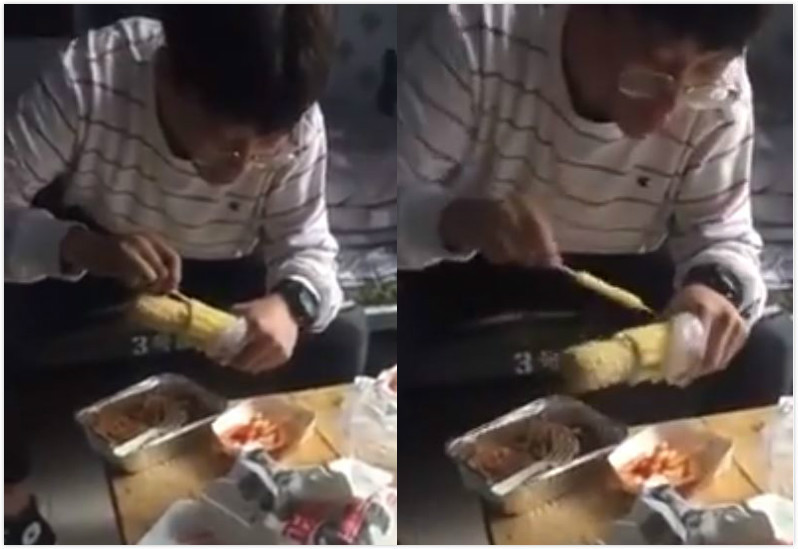 網友前天在爆笑公社po文笑說,「吃玉米你還用啃的,那就落伍了!」從影片中可見,這位眼鏡哥左手握著玉米,右手拿竹籤,就這樣插進去,接著把整排玉米串起來,然後一口吃下。