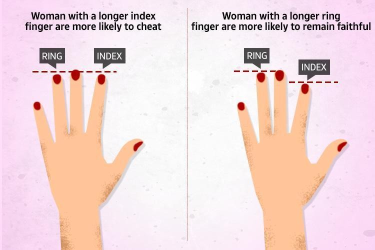 英國牛津大學的學者最近發表研究指出:左手食指較長、無名指較短的女性,在感情關係上較衝動,男性追求者亦較多,所以「偷吃」機率較高。 研究分析,此一現象跟這類女子子胚胎時期在母體內接觸了較多雌性賀爾蒙、比較「女性化」有關。