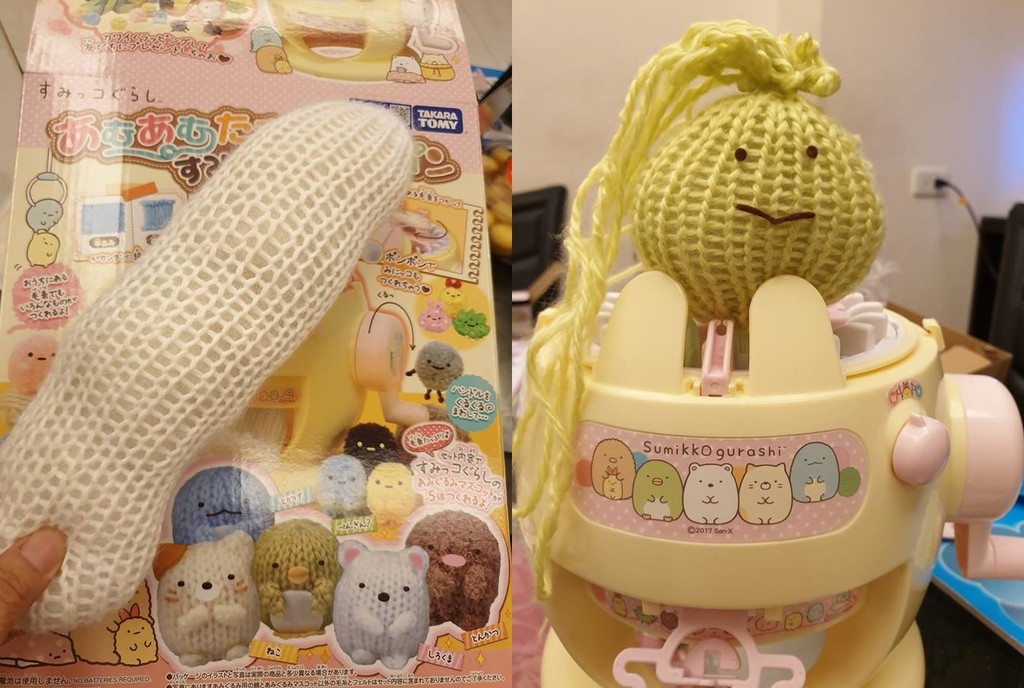 這名媽媽在社團中貼出她做出來的成品,白色的毛線中塞滿棉花,編織成一個長條狀的奇怪東西,「幫女兒買這台玩具,我以為做出來會像圖中的可愛娃娃,結果我做出來像白色絲瓜」,放在玩具盒子上,跟圖片中的「角落生物」絲毫沒有一分相似。