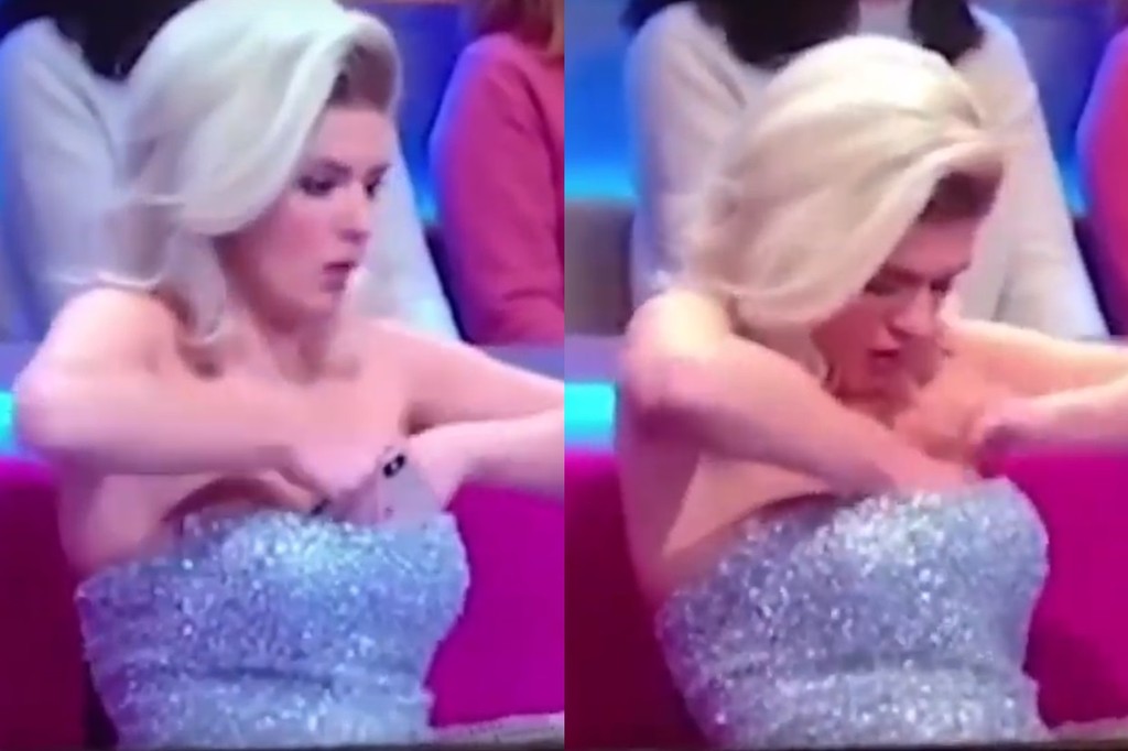 ▲烏克蘭女星節目上喬奶,下一秒拿出手機。(圖/翻攝自YouTube/Video Break)