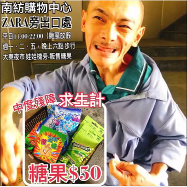 而「大口吃,大口玩台南」則補充說明,原來阿伯在國中時罹病導致「中度殘障」,說話跟行動都很不方便,每天在「南紡ーZARA出口處」賣糖果、口香糖,這裡出入的人其實很少,但阿伯說在這邊賣才不容易被驅趕。阿伯賣的糖果大多落在30~50元間,每周一、二、五,5點後就會收攤走到大東夜市的娃娃機旁邊販賣,希望大家看到這篇文章,可以分批前往購買,讓阿伯的生活更好過些,也讓愛心成為日常。