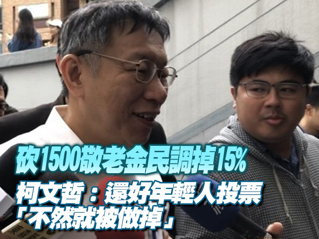 柯文哲說,可是當選票很有用,老人的選票很有用,畢竟最慘的是花了只能增加不能減少,越加越多,所以在台灣重陽敬老金估計大概兩、三年後要花60億,一年60億,十年就是600億,如果台灣政府一開始下定決心,用十年的時間,把台灣老人福利系統做好,應該能改善。柯笑說「自從民調掉了15%以後,再也沒人敢跟進。」還好年輕人有出來投票,不然就被做掉。