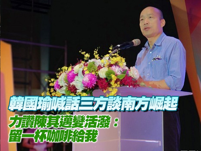 準高雄市長韓國瑜8日上午到高雄科技大學參與校慶,而他在被記者問及有關陳其邁發咖啡一事,幽默回應:「希望他留一杯給我」。另外,韓國瑜也在演講中對大學生、校方、社會各界喊話,希望學生們能不斷警惕自己;校方可以當市府的親密合作者;而社會各界可以好好把握此次南方崛起的機會。