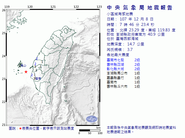 西部海域今(8)接連發生兩起有感地震,分別是上午7點46分和中午12點39分,規模皆是3.6,最大震度同樣落在台南市七股2級,對此,中央氣象局地震測報中心表示該震央位置特殊,且不排除出現零星餘震。