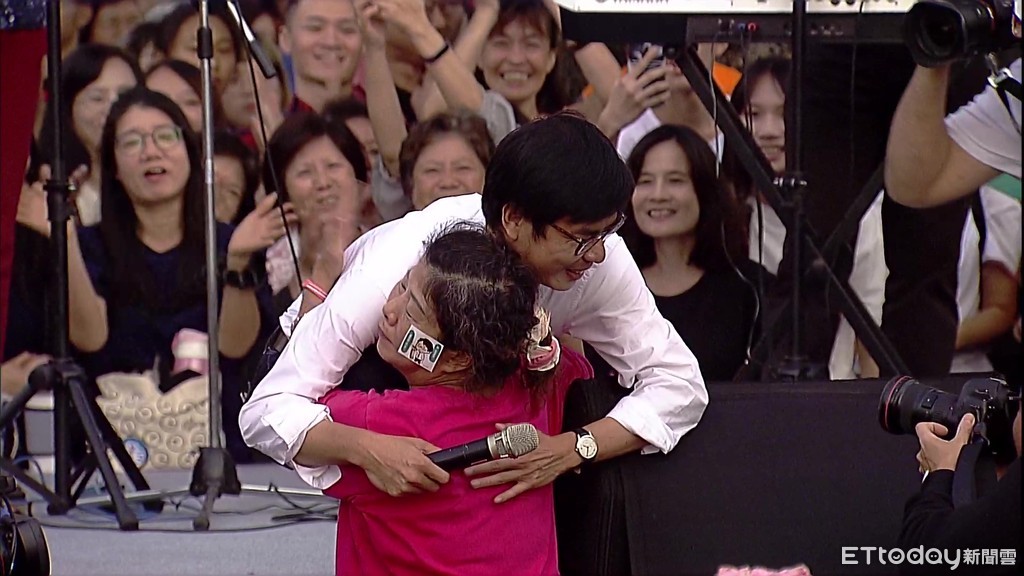 ▲岡山造勢晚會的「暈倒嬤」與陳其邁見面後,激動的上前擁抱。(圖/地方中心攝)