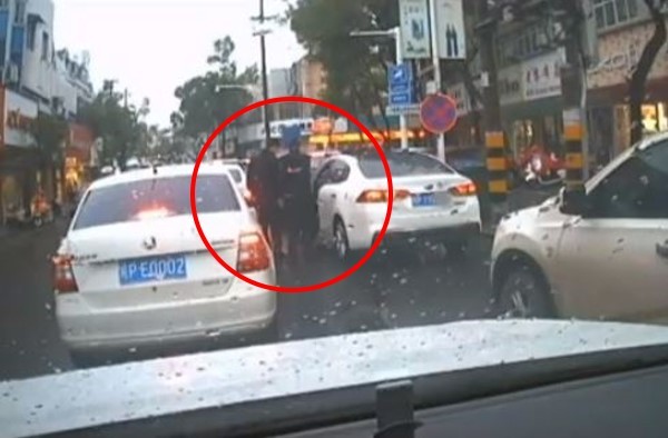 影片中,靠近外側車道的白色轎車被卡在車陣當中,駕駛或許是等到無聊想趁機清理一下車上的垃圾,於是伸手把飲料瓶、紙屑等東西從半開的車窗扔出,但垃圾落地才1秒鐘,兩名民警就從畫面右下角走向白色轎車。