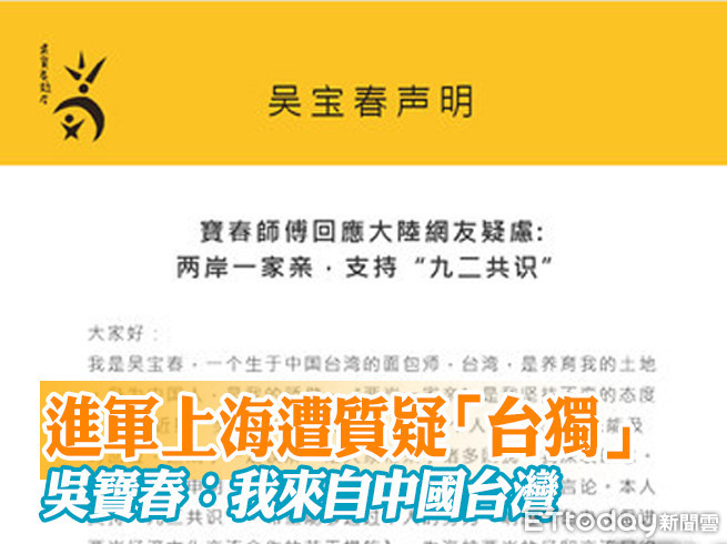 近日飽受開店爭議的麵包大師吳寶春,在於輿論壓力下,首度打破沉默,發出聲明稿釋疑。聲明稿開頭以「兩岸一家親,支持九二共識」的標題,強調他不是「台獨分子」,文末還有吳寶春的親筆簽名做為證明。吳寶春在聲明稿中表示,我是生於中國台灣的麵包師,台灣是養育我的土地;身為中國人,是我的驕傲。