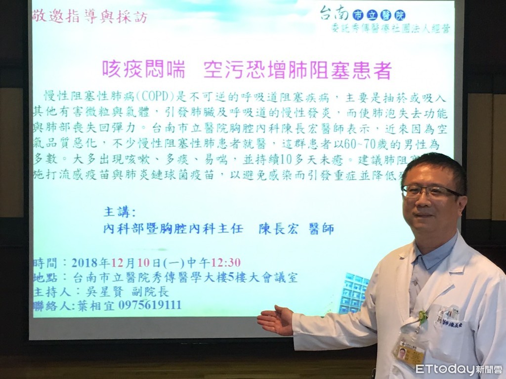 陳長宏醫師表示近來因為空氣品質惡化,不少慢性阻塞性肺患者就醫,這群患者以60至70歲的男性為多數。大多出現咳嗽、多痰、易喘,並持續10多天未癒。