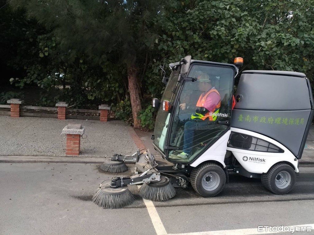 ▲台南市環保局購置3輛進口的小型清掃機具,負責清掃慢車道、人行道、公園周邊道路的砂石、樹葉,防空污再升級。(圖/環保局提供,下同)